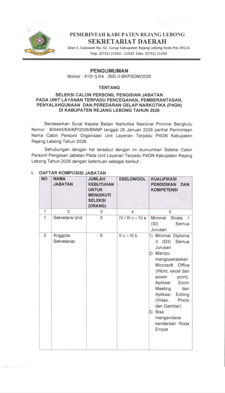 PENGUMUMAN SELEKSI CALON PERSONIL PENGISIAN JABATAN PADA UNIT LAYANAN TERPADU PENCEGAHAN, PEMBERANTASAN PENYALAHGUNAAN DAN PEREDARAN GELAP NARKOTIKA (P4GN) DI KABUPATEN REJANG LEBONG TAHUN 2026